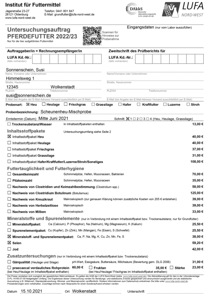 Damit man dieser Werte dann auch erhält, muss im "Untersuchungsauftrag Pferdefutter" das Kreuzchen bei "Inhaltsstoffpaket Heu" gesetzt werden.